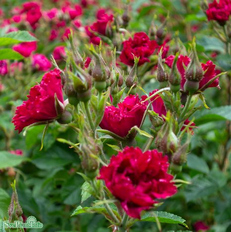 En buskros med tätt, kraftigt och buskigt växtsätt. Blommorna är små, tätt fyllda, karminröda med fransade kanter och sitter i klasar. Saknar doft och bildar inga nypon. Mörkgrönt och glänsande bladverk. Rikligt kontinuerligt blommande\* under juni-november.